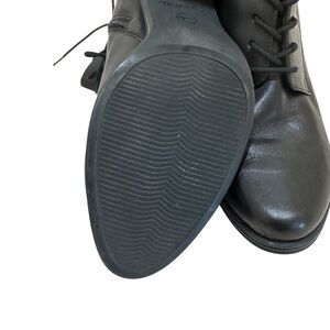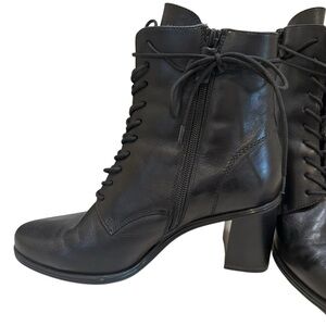 vintage-inspired boot crafted using beautiful black leather uppers. Inside zip closure provides easy on and off, while front lace-up panel allows for a customizable fit. Ankle-height bootie features