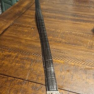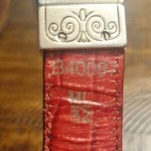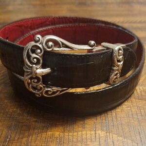 This stylish black and red reversible leather belt features an ornate silver buckle, perfect for adding a touch of sophistication to any outfit. Size M/l length measures 34" from buckle to largest hole. No flaws.
