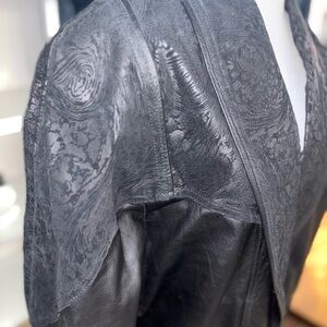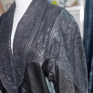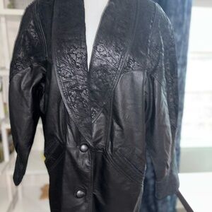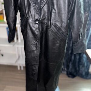 Stylish long black leather coat. Features intricate detailing on the shoulders. Perfect for a sophisticated look.