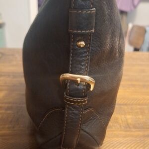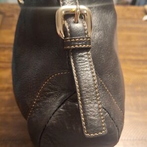 This elegant black leather shoulder bag is perfect for any occasion. Its sleek design and high-quality material make it a must-have accessory. The versatile black color complements any outfit. Silver hardware. Measures 15" by 11" It is in excellent pre-owned condition. Inside is very clean.