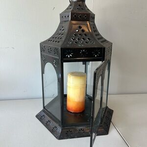Illuminate your space with this elegant black metal lantern. Its intricate design adds a touch of sophistication to any room.