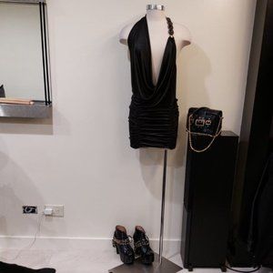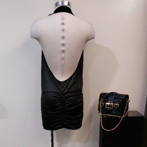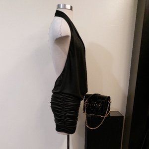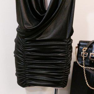This elegant black mini dress is perfect for a night out. Its sleek design and stylish draping make it a standout piece in any wardrobe.