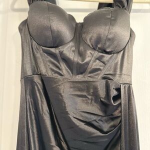 Step into elegance with this stunning black off-shoulder evening dress. Perfect for any special occasion, this dress features a sleek design and a flattering fit. ***Brown and pink dress photo shown is just to show as example on. The dress for sale is black satin, only worn once for a cruise.