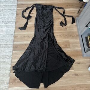 Step into elegance with this stunning black off-shoulder evening gown. Perfect for formal occasions, this dress features a sleek silhouette and stylish bow details on the sleeves. Make a statement with timeless black elegance.