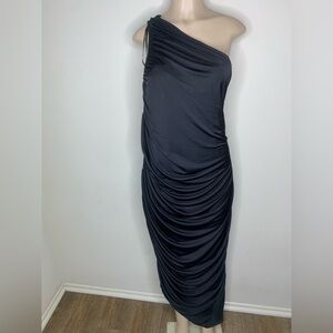 This elegant black one-shoulder dress is perfect for any special occasion. Its sleek design and classic color make it a versatile addition to your wardrobe.