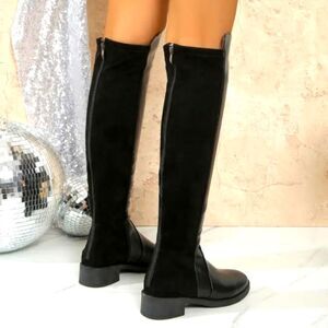 Step out in style with these elegant black over-the-knee boots. Perfect for any occasion, they offer both comfort and sophistication.Faux leather in front suede in the back.