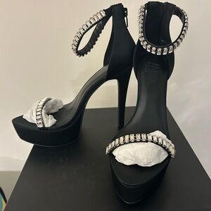 Step out in style with these elegant black platform heels. Adorned with sparkling rhinestone accents, they add a touch of glamour to any outfit. Perfect for special occasions or a night out.
