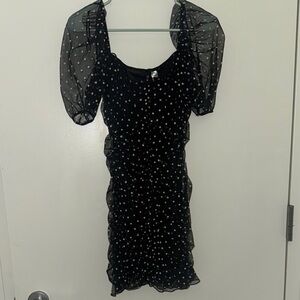 Step out in style with this elegant black polka dot dress. Perfect for any occasion, this dress combines classic design with modern flair. The sheer sleeves add a touch of sophistication.