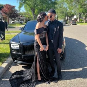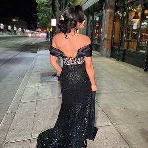This is an elegant formal dress. Perfect for prom or a formal occasion. Fully black sequined skirt with a split on the side and a satin off the shoulder sleeve. Zip up and Laced up back. Dress only worn for a few hours. For the type of dress this is you can’t beat the price in the size it is. Dress is a unique style.