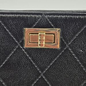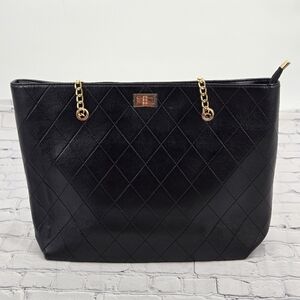 This elegant black quilted tote bag is perfect for any occasion. Featuring a sleek design and gold chain accents, it adds a touch of sophistication to your outfit.