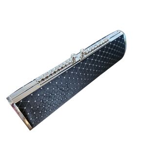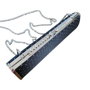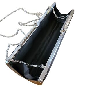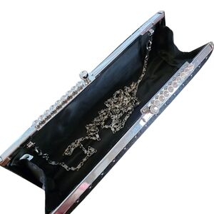 Turn heads at your next event with this stunning vintage-inspired black clutch! This sleek hard-shell evening bag features a satin diamond-quilted exterior adorned with shimmering silver detailing and a silver-tone kiss-lock clasp lined with clear crystal gems for that extra sparkle. β¨