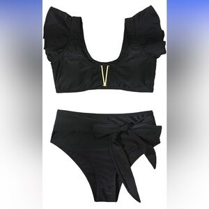 This elegant black bikini set features stylish ruffle details and a flattering fit. Perfect for a chic beach look.