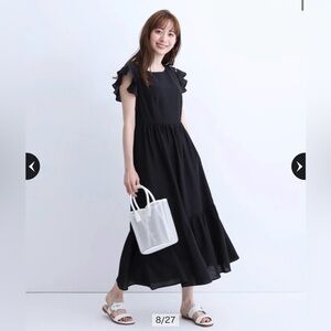 This elegant black dress features stylish ruffle sleeves, perfect for any occasion. Its classic design offers a timeless look.