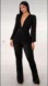 Chic black jumpsuit with sheer long sleeves. Features a deep V-neckline and stylish draped design.
