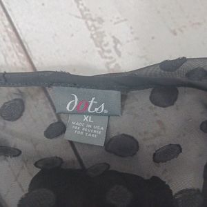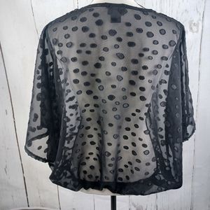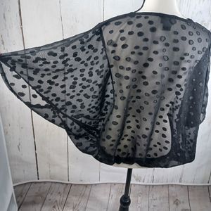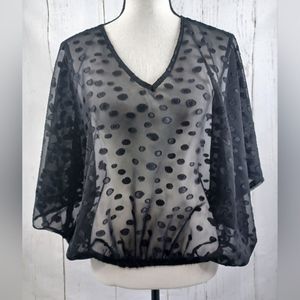 This elegant black sheer top features a stylish polka dot design, perfect for any occasion. Its flowing sleeves and comfortable fit make it a must-have addition to your wardrobe. Dots brand.