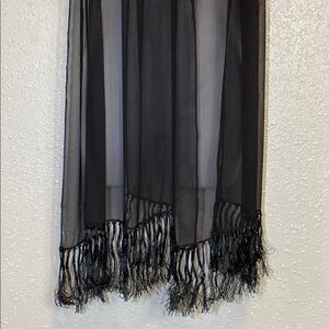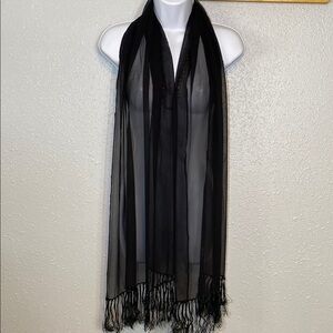 This black wrap is crafted from a lightweight, sheer fabric that exudes elegance and versatility. The decorative fringe tassels add a sophisticated touch, making it perfect for various styling options. Ideal for draping or wearing as a shawl, this accessory is a must-have for any wardrobe. Approximately 68” + 5” fringe on both ends x 21” wide. GUC.
