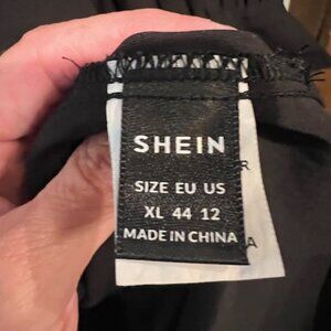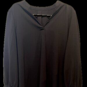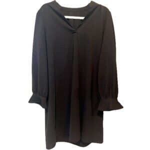 Black, long-sleeve tunic-style dress with a V-neckline and cuffed sleeves.
