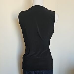 This elegant black sleeveless top features stylish shoulder details, perfect for any occasion. Its sleek design offers a flattering fit.