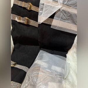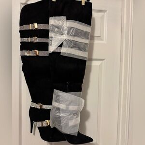 Step out in style with these elegant black stiletto boots. Featuring dazzling gold accents, these boots are perfect for any occasion. Elevate your wardrobe with this chic and sophisticated footwear.