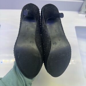 These black stiletto heels feature a glamorous glitter finish, perfect for evening events. The pointed toe and platform sole offer a stylish look while providing added comfort. Ideal for formal occasions, these heels will make a sparkling statement.