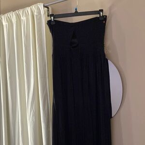 Stunning black strapless gown featuring elegant gold accents. Perfect for formal occasions.