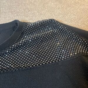 Stylish black knit sweater from LIV Milano, featuring a shimmering sequin mesh overlay across the shoulders and upper sleeves. A perfect mix of comfort and sparkle—great for dressing up a casual outfit or wearing for an evening out.