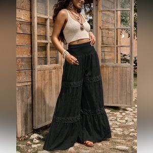 Elegant Black Textured Maxi Skirt with Lace Trim