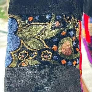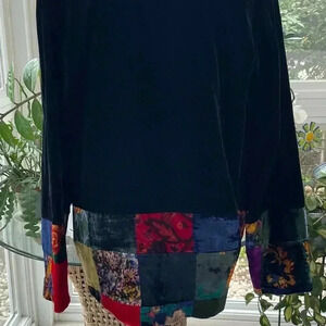This elegant black velvet jacket features a unique patchwork design at the hem, adding a touch of vibrant color and style. Perfect for any occasion, this jacket combines comfort and fashion effortlessly.