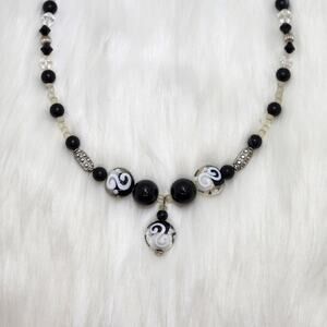 Elevate your style with this elegant black and white glass beaded necklace. This stunning piece features a combination of black, clear, and white beads, with silver tones accents adding a touch of sophistication to any outfit. The necklace is perfect for various occasions and is a great addition to any jewelry collection.