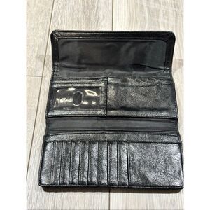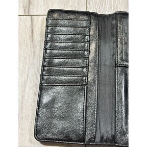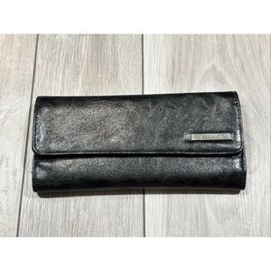 This sleek black clutch is perfect for any occasion. Its elegant design adds a touch of sophistication to your outfit.