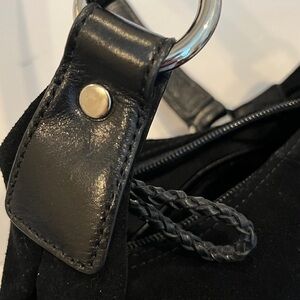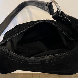 This elegant black suede handbag is perfect for any occasion. Its sleek design and versatile color make it a must-have accessory. Size is 12 “ long x 8 “ w , with the strap is about 18 “ long , the strap is leather and is very good condition and well care for, no mayor scratches or missing parts, no odor, roomy inside with inside zipper pocket and extra 2 compartments .