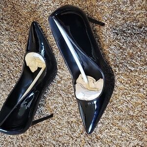 Step out in style with these elegant black heels. Perfect for any occasion, these shoes offer both comfort and sophistication. Heels do have a sheen/shiny look. With a 4" heel, these shoes will be a very flattering addition to your wardrobe. NWOT! NEVER WORN AND IN EXCELLENT CONDITION!!!