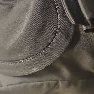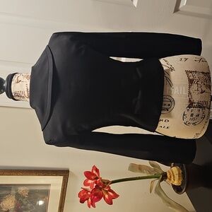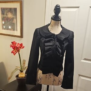 This elegant black women's jacket features a stylish design with a sophisticated touch. Has cute little pleats on the back at the base of the jacket. Gives a nice form fitting look with six eye hooks. I always wore it for Christmas with gold wide slacks and black heels. Dress it down with dark jeans and black heels or flats