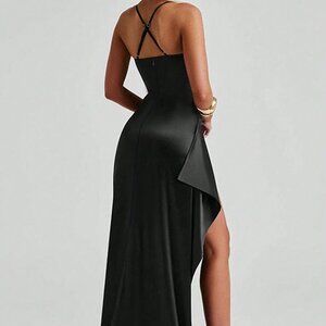 Elegant Black Women's Trim Waist Sexy Satin Ruffle Maxi dress Party