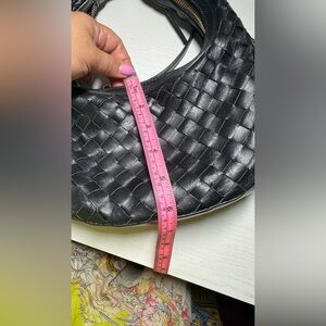 This stylish black woven hobo bag is perfect for any occasion. Its elegant design and versatile color make it a must-have accessory. In pristine condition.