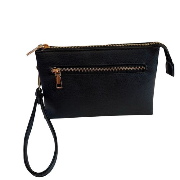 This sleek black wristlet clutch is perfect for any occasion. Its clean simple design makes it a versatile accessory for day or night.