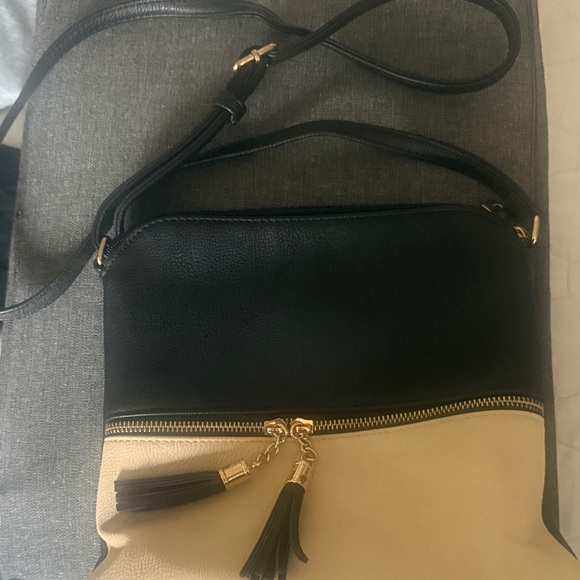 This stylish crossbody bag features a sleek black and cream design, perfect for any occasion. The elegant tassel detail adds a touch of sophistication. Ideal for everyday use or a night out.