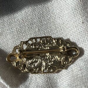 This elegant brooch features a striking black stone set in a detailed gold frame, perfect for adding a touch of sophistication to any outfit. 2 inch length by 1 inch height.