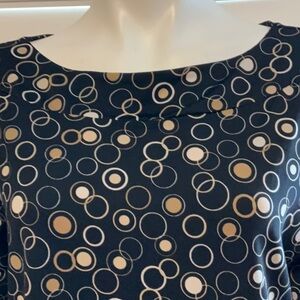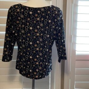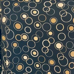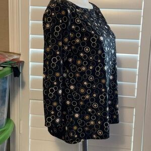 Elevate your wardrobe with this elegant black blouse featuring a striking gold circle pattern. Perfect for both casual and formal occasions.