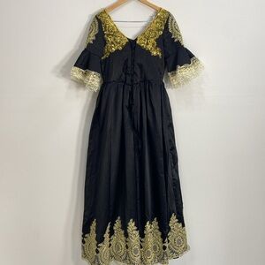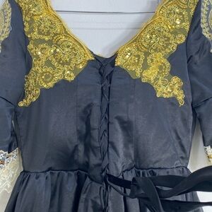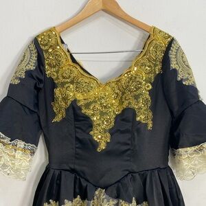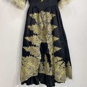 This stunning black and gold dress features intricate lace detailing, perfect for any special occasion. The elegant design offers a sophisticated look.