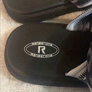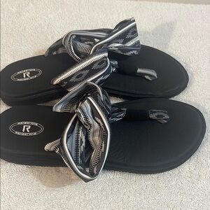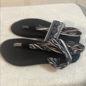 Experience comfort and style with these elegant black and gray sandals. Perfect for any casual occasion.
