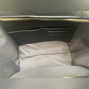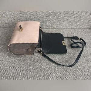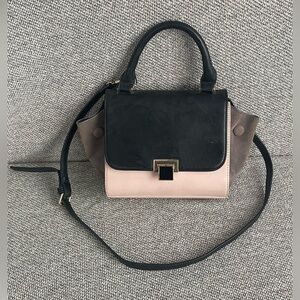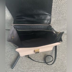 This satchel features a sleek black top flap and handles paired with a soft pink body, creating a striking contrast. Its structured design is highlighted by a gold-toned clasp, adding a touch of sophistication. The detachable shoulder strap offers versatile carrying options.