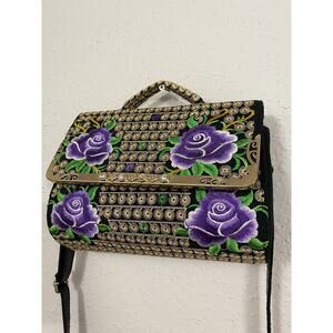 This stylish shoulder bag features a striking black base adorned with beautiful purple floral designs. Perfect for adding a touch of elegance to any outfit.