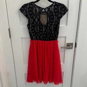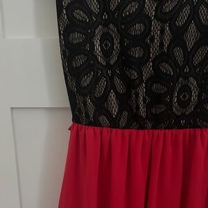 This elegant dress features a beautiful black lace top with a vibrant red-pink skirt, perfect for special occasions. The intricate lace design adds a touch of sophistication.