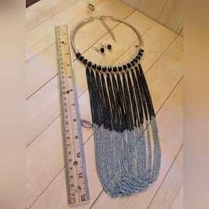Elegant Black and Silver Fringe Necklace Set Costume Jewelry