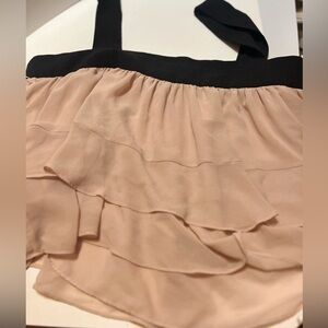 This elegant women's top features a chic layered design in black and tan. Perfect for any occasion, it offers a stylish and comfortable fit.