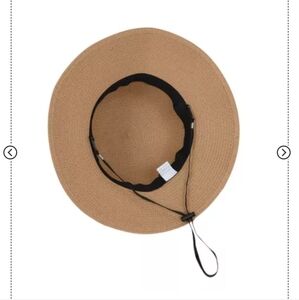 Chic and stylish wide brim hat in tan with a black ribbon. Perfect for adding a touch of elegance to any outfit.