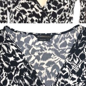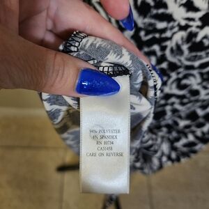 This elegant black and white floral dress is perfect for any occasion. Its sophisticated design and comfortable fit make it a must-have in your wardrobe. True wrap dress. plunge v-neck, flattering, size small.