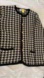 Stylish houndstooth cardigan with gold button details. Features classic black trim for a timeless look. Ideal for any occasion.
