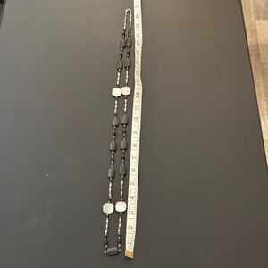 This elegant necklace features a stunning combination of black and white elements, perfect for any occasion. Its timeless design adds a touch of sophistication to your outfit. 21” long. Fun long statement necklace.